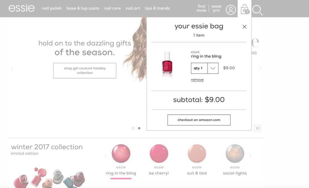 Persistent Cart Visibility: Designed a sleek slide-out "Your Essie Bag" modal that allows users to review selected items, adjust quantities, or remove products without navigating away from the seasonal discovery page.