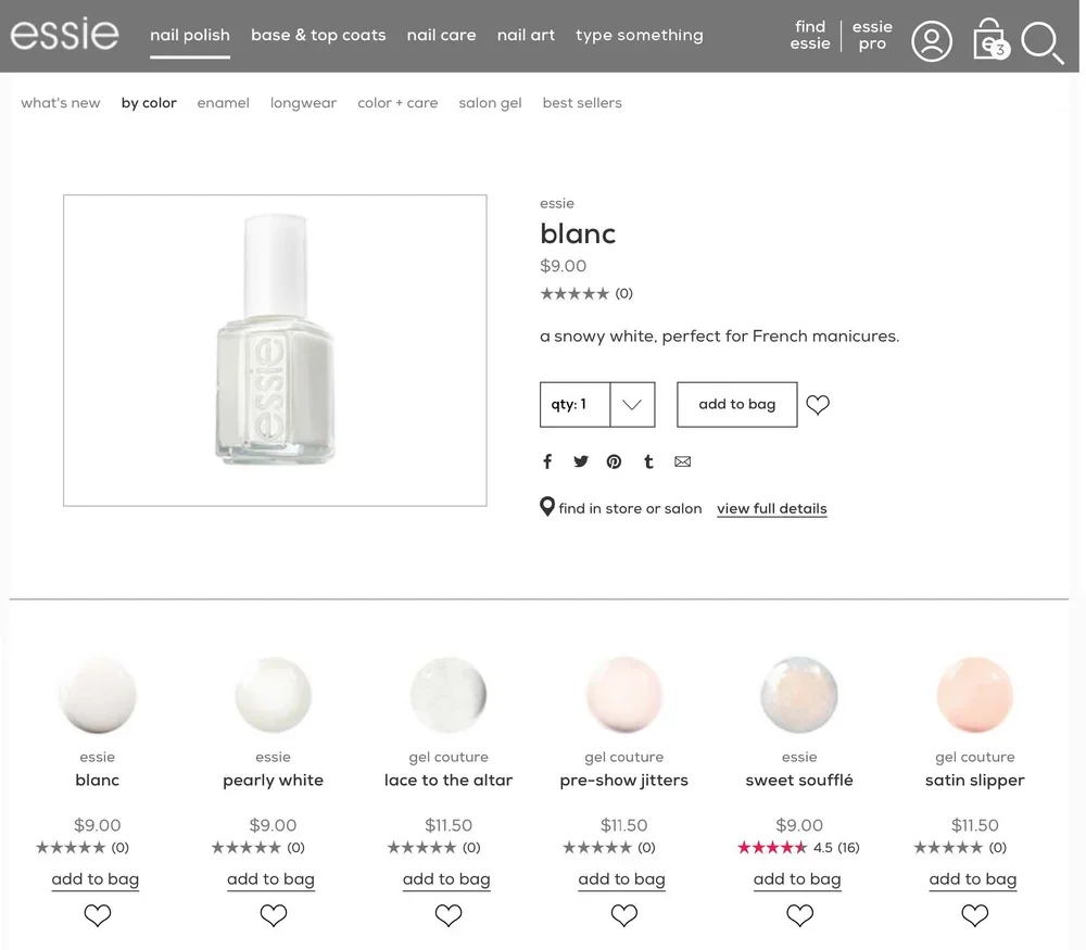 Discovery-Driven Cross-Selling: Implements a "By Color" recommendation row at the bottom of the interface, showcasing a curated gradient of related shades like "Pearly White" and "Satin Slipper" to encourage further exploration.